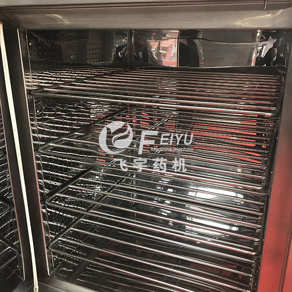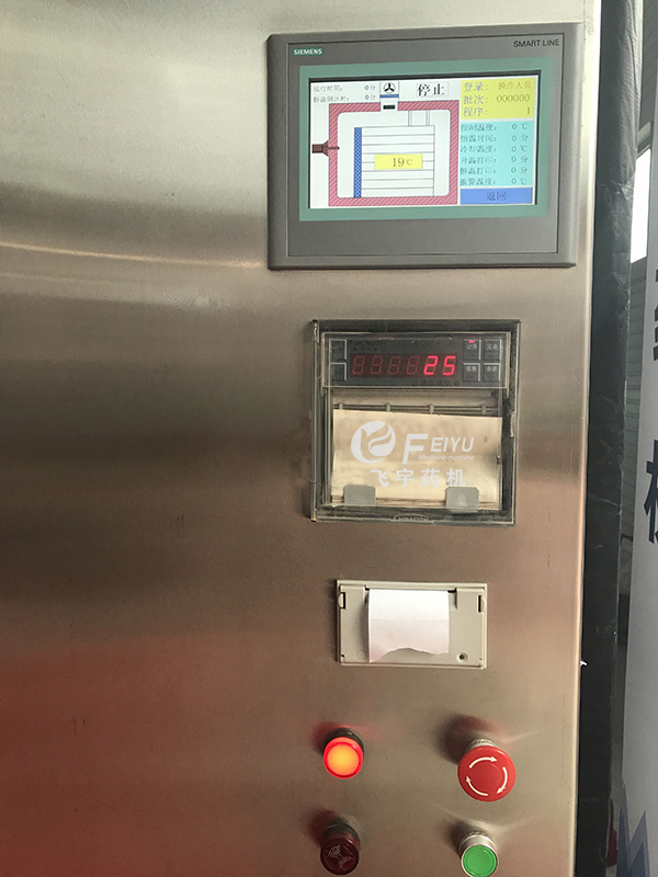 ⒋ 工作原理:將裝滿物料的烘盤、瓶子或小車放入箱內,啟動PLC可編程序控制系統(tǒng),內循環(huán)風機工作、加熱、蝶閥同時開啟、干燥箱迅速升溫。在內循環(huán)風機作用下,于熱空氣通過耐高溫高效過濾器進入箱體,在微孔調節(jié)作用下形成一個均勻分布空氣向箱體內傳遞,干燥空氣吸收瓶子(物料、物品)表面的水分,進入加熱通道蒸發(fā)排出、干空氣在風機作用下定向循環(huán)流動,水蒸汽排出。隨著水蒸汽逐漸減少、同時間隙性補充新鮮過濾空氣,箱體內呈微正壓狀態(tài),恒溫結束,過程控制完畢。開啟送風或(進水)強制冷卻,自動蝶閥進入關閉狀態(tài),聲光提示開門出瓶。